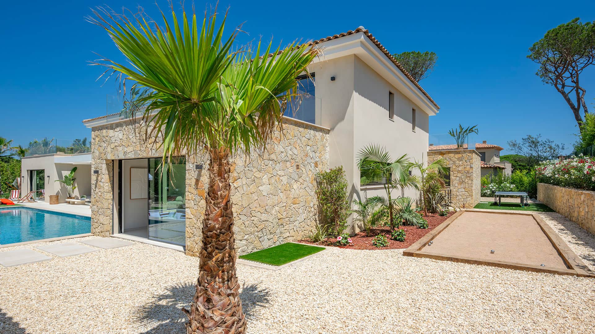 The welcoming garden, dotted with majestic palm trees, leads to the heated swimming pool, the central point of the sunlit property. This area also includes a pétanque court and a pool house featuring an outdoor bar and a large table. The exterior decor blends art-deco with organic elements, creating the perfect ambiance to enjoy every moment by the water.